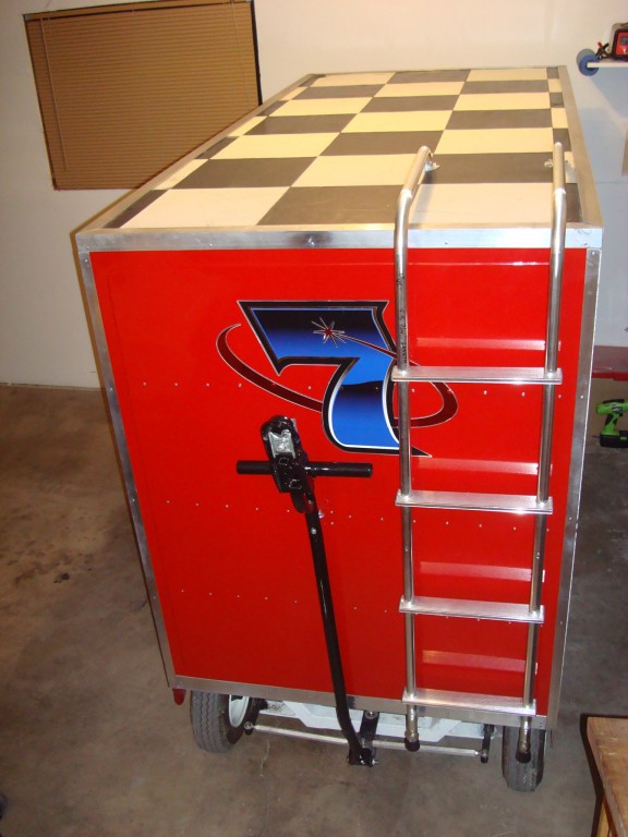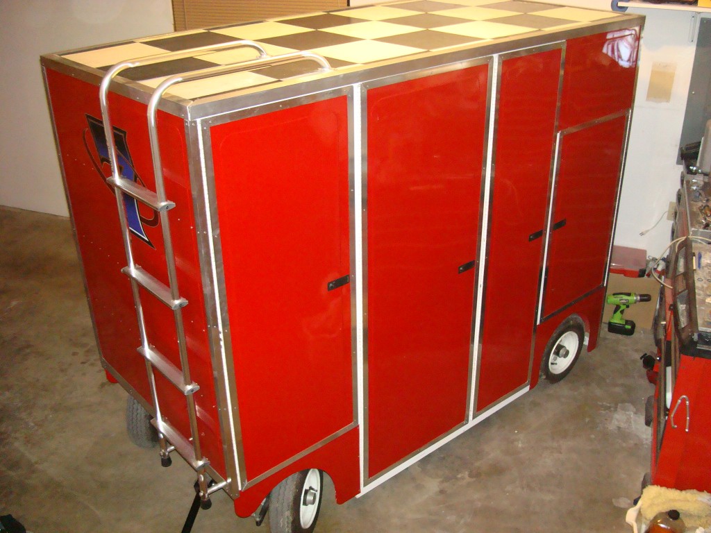 73"h x 42.5"w x 87.5" L Fresh powdercoat, boxed steel frame, (2) aerosol cabinets (2) Craftsman tool chests, (2) large lockers (2) large shelf compartments, plus other storage. Mounted aluminum ladder, checkerboard top, covered workbench area, tow hitch handle, rolls and turns easy. Hard to find a nice one like this!! $3450