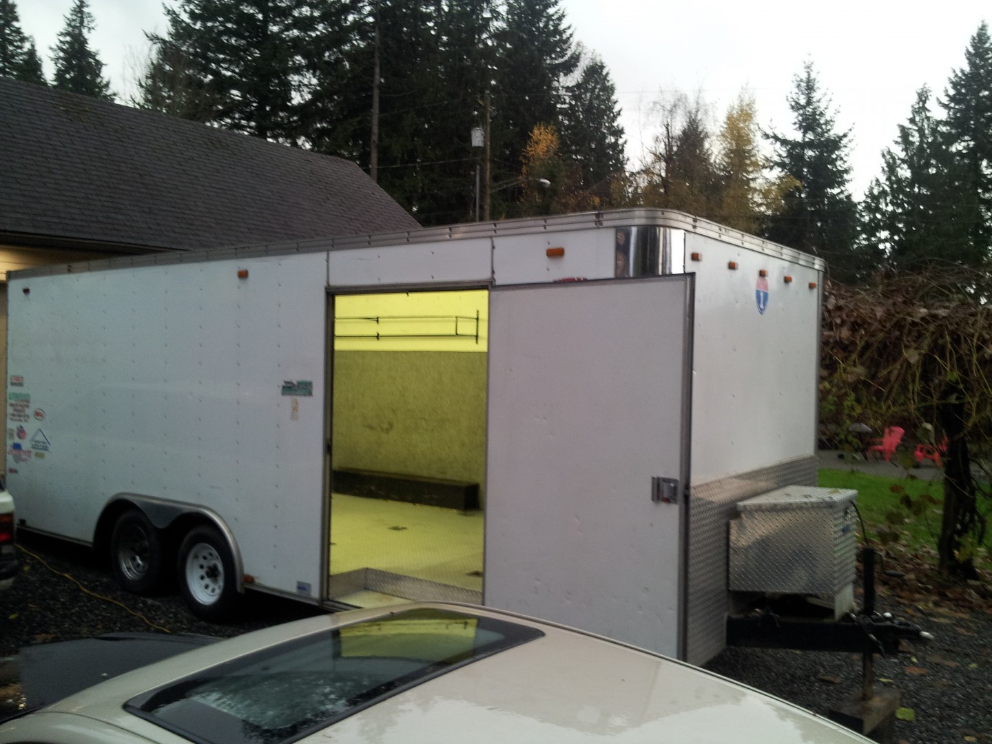upper and lower cabinets, power and lights, diamond plate floor and tongue box, Torsion bar suspension with bearing buddys. Comes with hitch and load levelors.