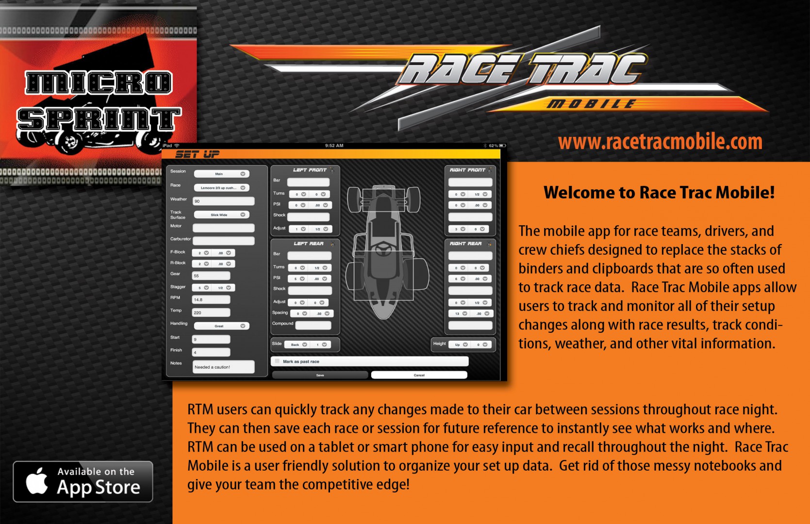 Race Trac Mobile-Micro Sprint is now available on the App store! Upgrades include: Inventory page, e-mail capabilities, and more ways to describe track conditions and car handling. Type 'race trac mobile' in search field of the app store from your Iphone or Ipad. (best used for tablets)