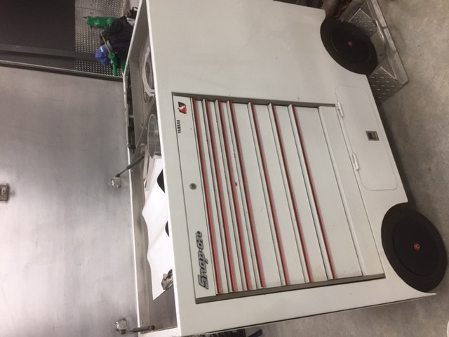 Pit cart - all aluminum construction - Snap on tool box. Comes with retractable dual halogen lighting setup (not shown). Last used @ Deming and Skagit in 1999, was very effective at housing all the tools and spares required - very visible for sponsor representation. Time to clear some space in the shop.