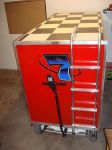 73"h x 42.5"w x 87.5" L Fresh powdercoat, boxed steel frame, (2) aerosol cabinets (2) Craftsman tool chests, (2) large lockers (2) large shelf compartments, plus other storage. Mounted aluminum ladder, checkerboard top, covered workbench area, tow hitch handle, rolls and turns easy. Hard to find a nice one like this!! $3450